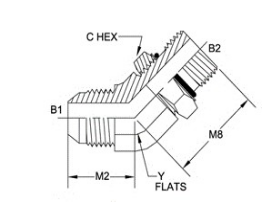 Product ID | Descri ption | TUBE O.D. | B1 SAE37 | B2 SAEORB | B1 DRILL | B2 DRILL | M2 LGTH | M8 LGTH | C HEX | Y FLATS |